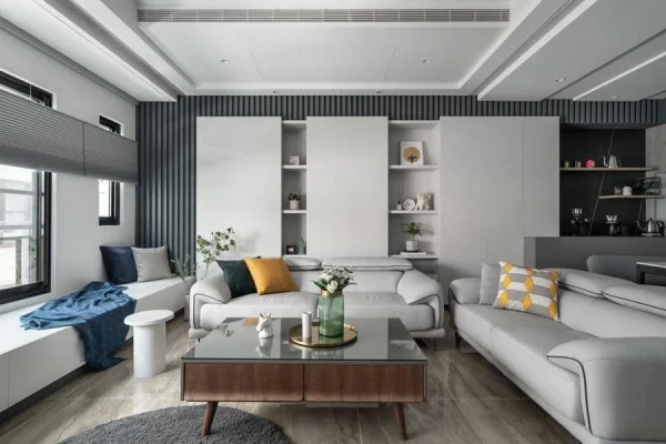 Cải tạo phòng khách chung cư sang trọng hơn thể hiện ở chất liệu, kiểu dáng và cách sắp xếp vật dụng. KTS đã tư vấn gia chủ nên thay mới 1 số vật dụng trong các phòng để tạo làn gió mới. Sàn ốp gạch vân đá cao cấp thay vì mẫu sàn trơn trước kia. Dùng bộ sofa văng kết hợp bàn uống nước mặt kính. Khu vực gần cửa sổ phòng khách có đặt thêm bục gỗ dài để ngồi đọc sách hoặc thư giãn. Căn hộ hiện đại sang trọng này dùng cửa sổ kính, rèm cuốn.