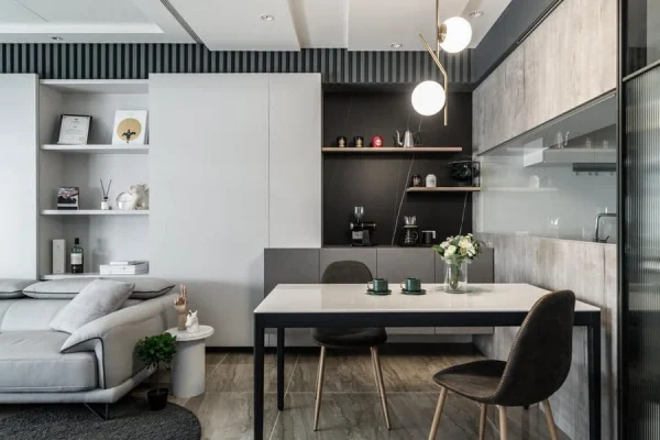 Phòng bếp chung cư ngăn cách với phòng khách bởi cửa kính và tường ốp gỗ. Ở phòng bếp có thể nhìn thấy ở phòng khách mà vẫn đạt được hiệu quả ngăn mùi.