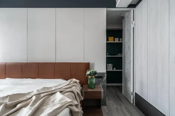 Phòng ngủ chung cư thay bằng giường da màu nâu sang trọng. Kê đặt tủ đồ phía sau để tiết kiệm không gian. Màu sơn tường cũng được thay mới để phù hợp hơn với màu tổng thể chung của các đồ dùng.