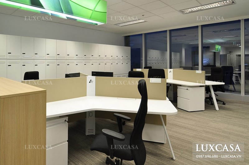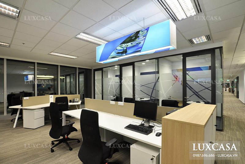 Trong mỗi không gian đều được trang bị bàn làm việc màu trắng kết hợp vách gỗ lưng chừng ngăn cách các vị trí, ghế đen có chân xoay linh hoạt. Phía trên là chiếc đèn hộp đẹp mắt. Nhìn chung nội thất trong phòng làm việc khá đơn giản, hướng tới sự chuyên nghiệp, không cầu kỳ nhưng vẫn đảm bảo đem tới sự thoải mái nhất cho nhân viên khi làm việc.