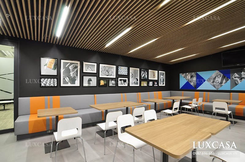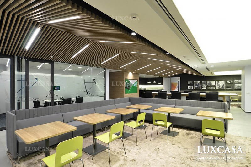 Khu vực này chúng tôi lựa chọn bố trí dãy ghế bọc nỉ êm ái màu xám xếp sát nhau tạo thành dạng chữ L đẹp mắt. Phía trước có 6 chiếc bàn gỗ tương ứng và thêm một vài chiếc ghế tựa lưng màu xanh non bắt mắt. Riêng phòng nghỉ còn được trang trí thêm bởi tấm thảm trải lông mượt mà, hệ thống đèn bóng dài xếp hình mái ấn tượng. Không gian thoáng đãng, không có vách ngăn sẽ giúp các nhân viên thoải mái hơn.