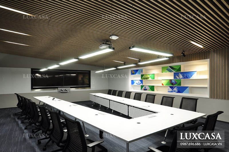 Đối diện chiếc bàn là một màn hình lớn để thảo luận các vấn đề trong cuộc họp. Đèn chiếu sáng cũng được bố trí chạy theo hình dạng của bàn họp. Một chiếc tủ nhiều hàng màu trắng vàng được ốp vào tường đẹp mắt. Những kẻ sọc ngang dọc của mái và tường ngăn tạo nên hiệu ứng sang trọng.