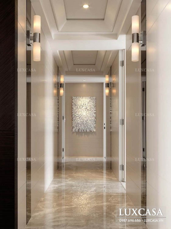 Hành lang của mẫu thiết kế cũng được thiết kế hết sức ấn tượng và phù hợp với không gian của ngôi nhà. Hành lang sử dụng những loại đá cao cấp với gam màu sáng kết hợp với một số chiếc đèn trang trí hết sức ấn tượng.