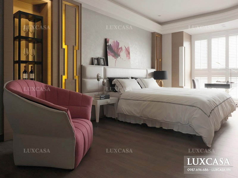 Cũng tương tự như những căn phòng khác, phòng ngủ với gam màu chủ đạo là màu trắng với điểm nhấn là một chiếc ghế sofa màu hồng để giúp bạn có không gian riêng để nghỉ ngơi hay đọc sách trước khi ngủ. Phòng ngủ được thiết kế hết sức đơn giản và hạn chế tối đa mọi đồ dùng trong phòng.
