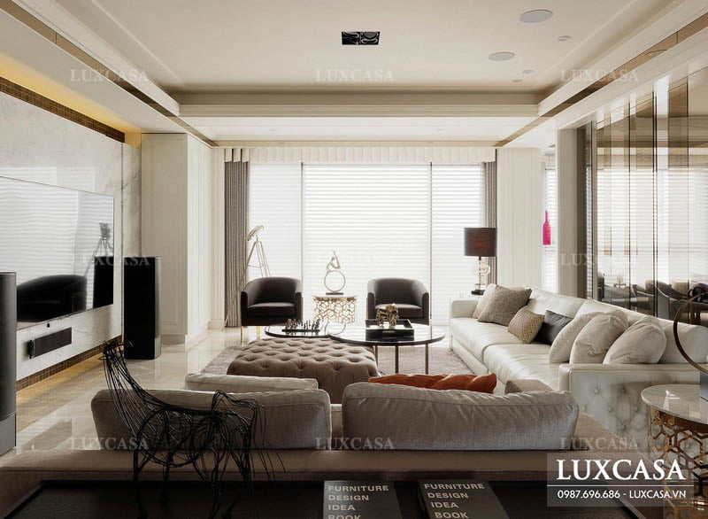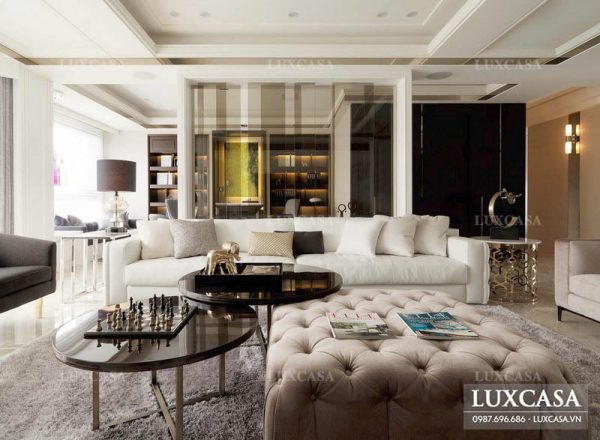 Sang trọng – đẳng cấp là những từ ngữ để nói về mẫu thiết kế dành cho phòng khách này. Ấn tượng nhất của phòng khách là bộ bàn ghế sofa đẹp, hiện đại có gối tựa rất thuận lợi để ngồi hay nằm xem phim. Các kiến trúc sư của Luxcasa đã sáng tạo khi sắp xếp mọi nội thất trong phòng khách hợp lý để đem lại không gian thoáng mát và rộng rãi.