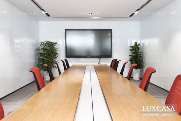 Nội thất phòng họp đơn giản với chiếc bàn gỗ dài ở giữa, hai hàng ghế tựa lưng màu đỏ kết hợp đen chạy dọc hai bên. Đối diện bàn họp là một chiếc tivi màn hình rộng, hai bên góc tường là hai chậu cây xanh trang trí thêm cho không gian.