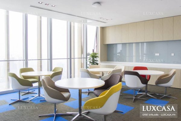 Phòng khách được chia thành từng nhóm bàn tiếp khách nhỏ, mỗi nhóm có 3 – 4 vị trí. Nội thất phòng khách cũng tối giản nhưng màu sắc bắt mắt hơn.