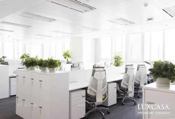 Thay vì sử dụng vách ngăn không gian kín khít, chật chội như lối thiết kế truyền thống, phòng làm việc của các nhân viên được KTS thiết kế mở rộng với việc ứng dụng những tủ đựng tài liệu làm vách ngăn. Trên mỗi tủ có những chậu cây xanh nhỏ nhắn giúp không gian tươi mới, thân thiện với tự nhiên hơn. Bên trái phòng là dãy ô cửa sổ đón nắng tự nhiên thoáng mát.