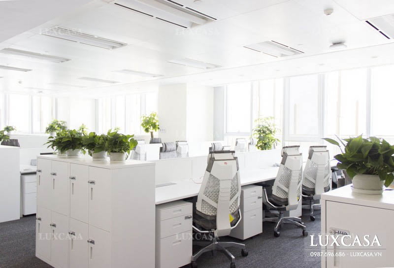 Khu vực làm việc của các nhân viên được bố trí nội thất khoa học, chuyên nghiệp. Những dãy bàn làm việc sơn trắng hiện đại, dưới mỗi bàn đều có một hộc tủ đựng tài liệu đồng màu.