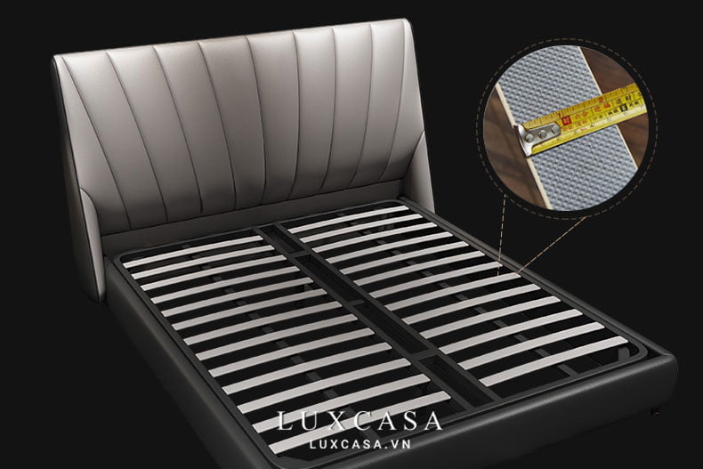 Phần khung giường được gia công hoàn toàn từ gỗ. Loại gỗ này mang nhiều ưu điểm: chống mối mọt, độ bền cao, chống ẩm, dẻo dai không dễ giòn và khả năng chịu lực cao.