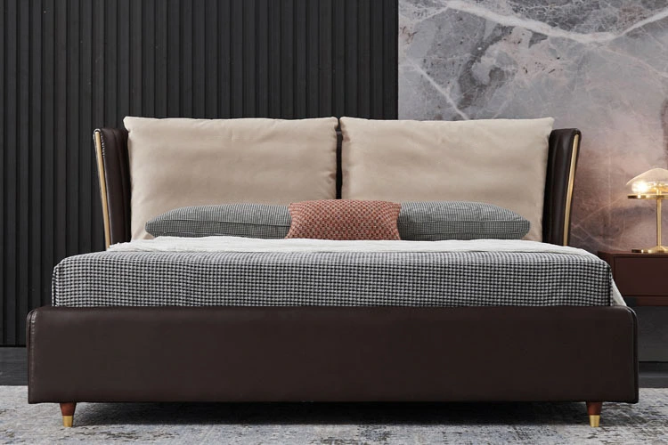 Thiết kế gối tựa dùng da mềm khác màu hướng đến trải nghiệm màu sắc khác biệt. Góc mép giường có thêm đường màu vàng cùng nâu bóng sang trọng.