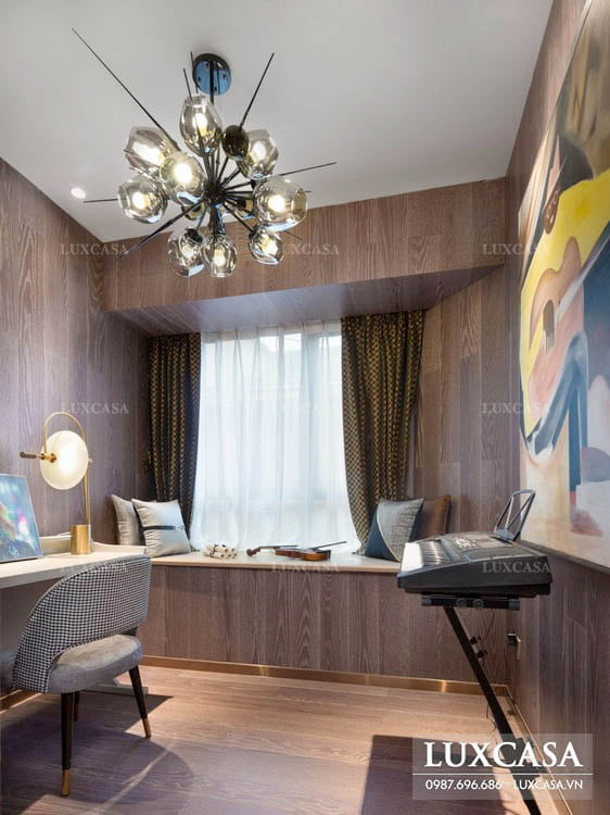 Do đó, không quá ngạc nhiên khi bạn bắt gặp những tấm tường hay sàn nhà đều lót bằng gỗ với những vân gỗ đa dạng và phong phú tạo nên một không gian ấm cúng. Với không gian này bạn có thể đặt một bức tranh điều này sẽ tạo được một điểm nhấn rất riêng biệt. Trong phòng làm việc được cách âm này bố trí nhạc cụ để sáng tác là chiếc violon, đàn organ và bàn ghi chép. Chưa kể đến là mẫu giường đơn dài tựa cửa sổ khi cần lấy cảm hứng sáng tác.