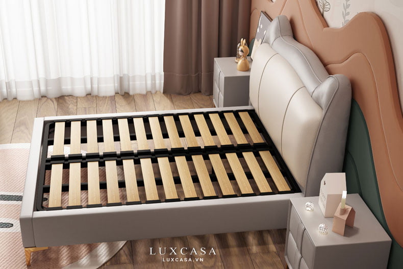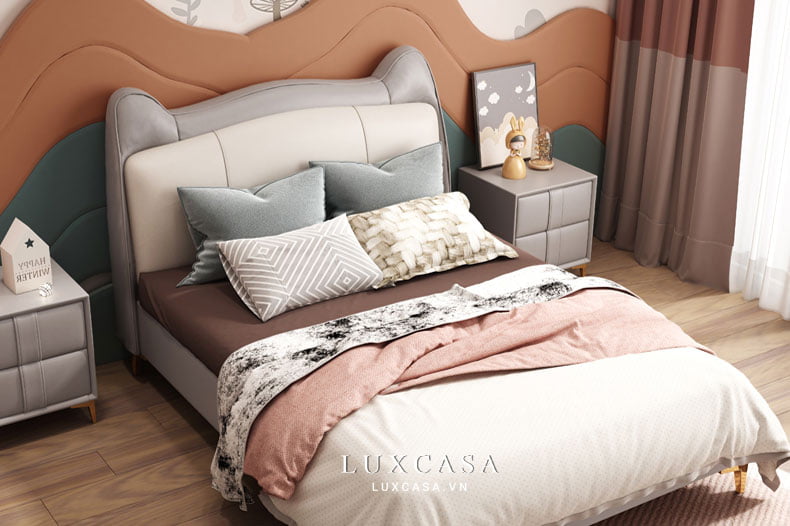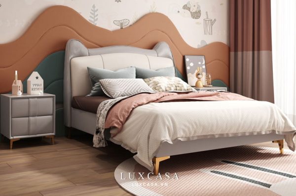 Điểm nổi bật của chiếc giường chính là sự kết hợp hoàn hảo giữa chất liệu và kiểu dáng. Lấy cảm hứng từ những nhân vật hoạt hình in đậm trong trí tưởng tượng của trẻ nhỏ, đầu giường được thiết kế với hình dáng tai của một chú gấu nhỏ, vừa đáng yêu lại vừa dễ thương, mang đến cho không gian phòng ngủ điểm nhấn đặc biệt. Được bọc toàn bộ giường là lớp da cao cấp, mềm mịn, có chứa những công nghệ cải tiến ngăn chặn những vi khuẩn gây ẩm mốc, bảo vệ sức khỏe của trẻ.