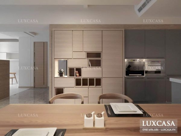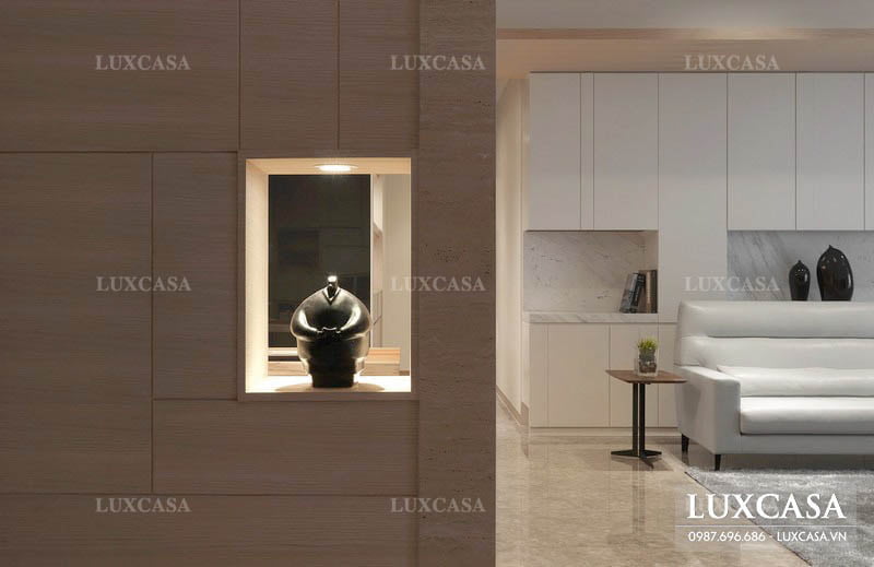 Luxcasa tạo điểm nhấn cho căn phòng nhờ các tủ gỗ công nghiệp sơn inchem cao cấp phía sau ghế sofa. Tủ vừa giúp trang trí cho không gian nổi bật, hiện đại vừa để lưu trữ đồ đạc trong gia đình rất tiện lợi.