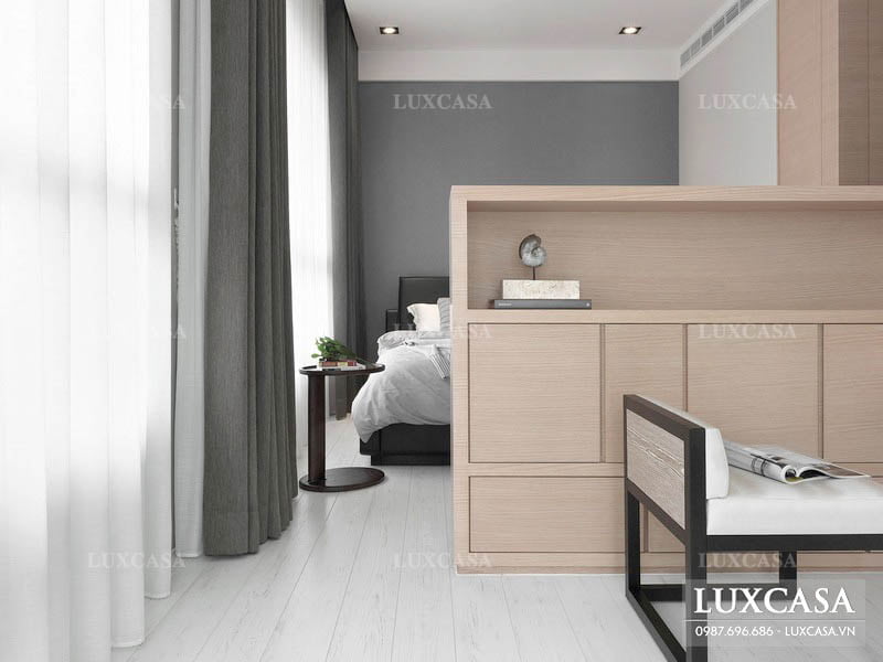 Dưới các bàn tay tài hoa của những kiến trúc sư của Luxcasa thì khách hàng có thể yên tâm về độ bền cũng như tính thẩm mỹ của các đồ nội thất. Hệ thống bàn, tủ và giường đều được thiết kế từ gỗ công nghiệp màu vàng sữa kết hợp với sàn gỗ màu trắng tạo nên sự tinh tế, sang trọng cho phòng ngủ.