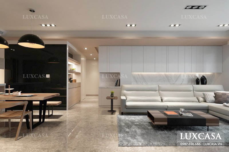 Tất cả tủ, ốp trần đều được sử dụng gỗ công nghiệp màu sáng sang trọng có tô thêm điểm nhấn là vách ngăn màu đen để ngăn cách phòng bếp với phòng khách. Ở giữa trung tâm phòng khách là bàn uống nước và thảm có màu đối lập với các đồ nội thất trong phòng giúp tạo điểm nhấn ấn tượng.