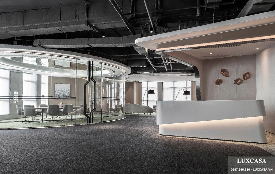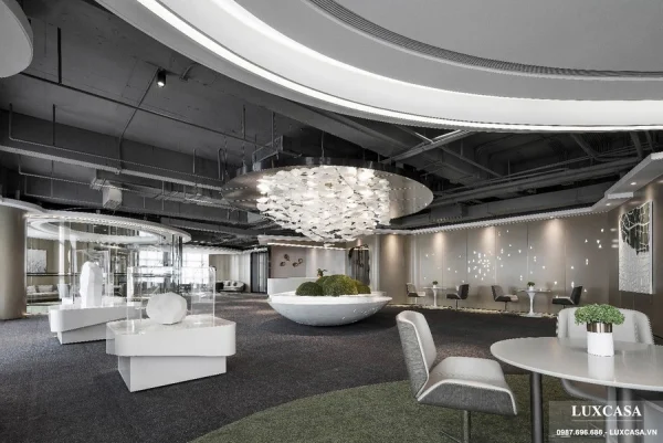 Phong cách thiết kế văn phòng mở tạo chiều sâu, mở rộng tầm nhìn. Quầy lễ tân màu trắng với đèn hub thu hút ở ngay gần cửa ra vào. Tại sảnh chờ này có trưng bày một số vật phẩm được đặt trong tủ kính phân bố kê sát tường. Một mặt là các ghế chờ, ghế nghỉ đơn với bàn tròn nhỏ.