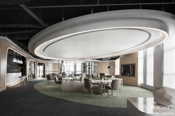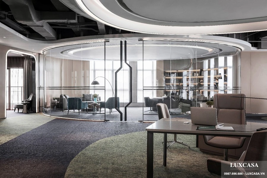 Mẫu thiết kế nội thất văn phòng cao cấp này sử dụng kính trong suốt để phân chia các phòng ban. Mỗi phòng nằm gọn trong hộp hình bầu dục