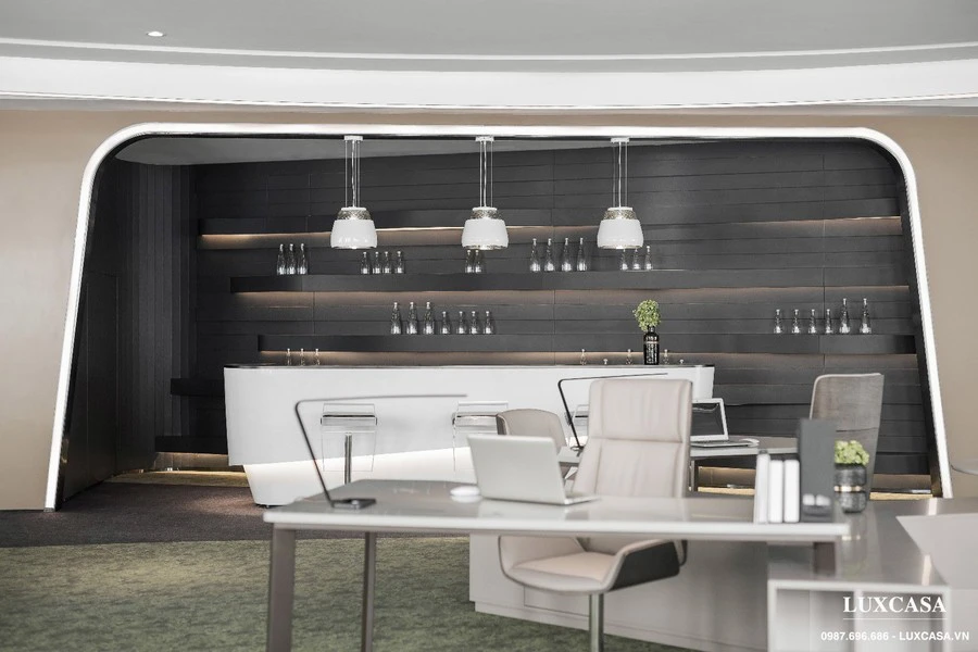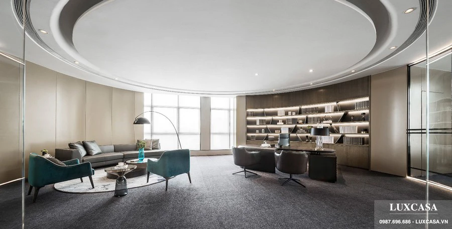 Điểm nhấn trong trang trí phòng giám đốc là ghế đơn màu xanh ngọc, bàn trà tròn 2 bậc đặt trên thảm tròn sáng màu hơn thảm trải sàn. Phòng giám đốc sử dụng cửa kính vừa đảm bảo sự riêng tư nhưng vẫn có thể bao quát toàn cảnh cả văn phòng