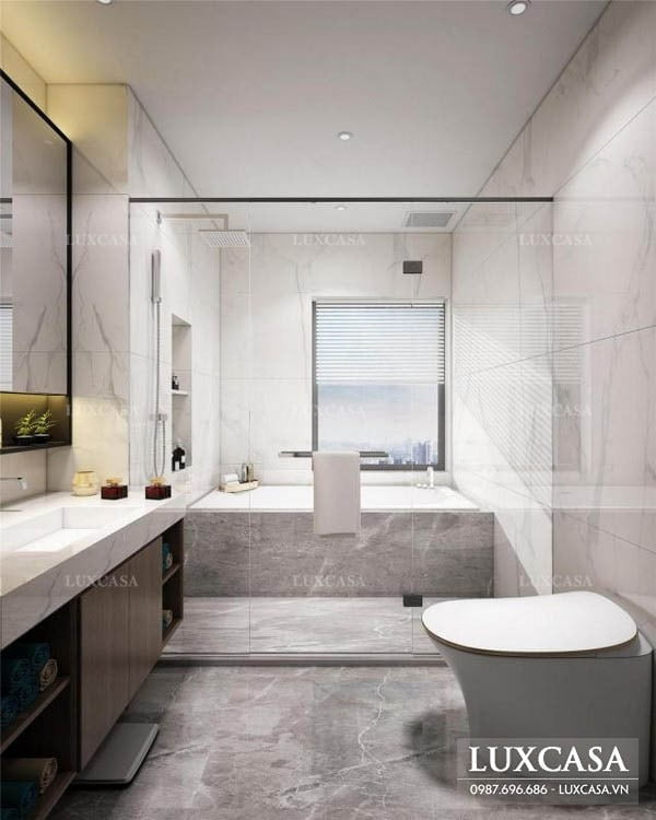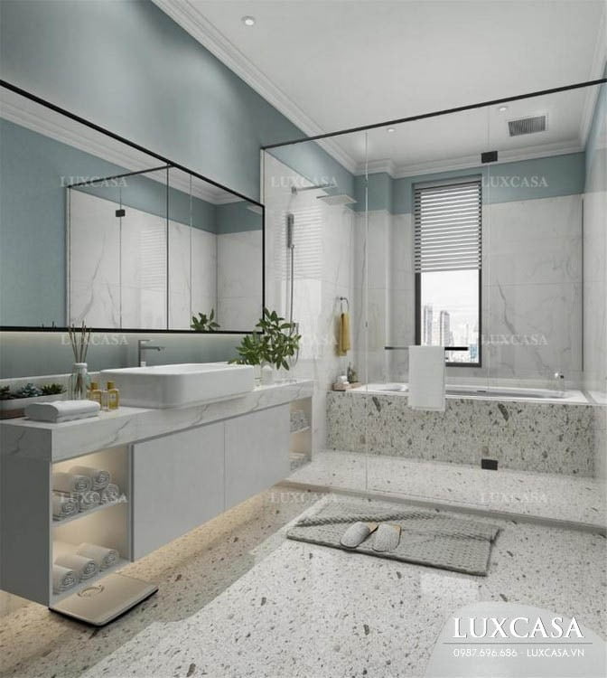 Xu hướng nội thất phòng tắm hiện đại, sáng tạo là tối giản chi tiết rường rà nhưng trau chuốt, tỉ mỉ và đẳng cấp trong từng thiết kế. Phòng tắm là không gian có độ ẩm cao nên trong thiết kế luôn đề cao tính mở của không gian. Điều này góp phần mang lại sự khô thoáng, sạch sẽ cho căn phòng. Với tông màu trắng pha vân đá giúp tăng khả năng bắt sáng của không gian và mang đến sự đẳng cấp, sang trọng trong thiết kế phòng tắm.