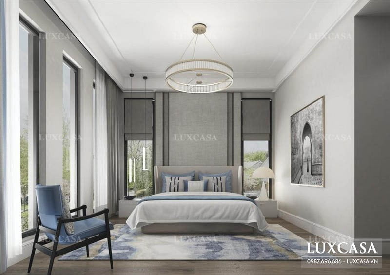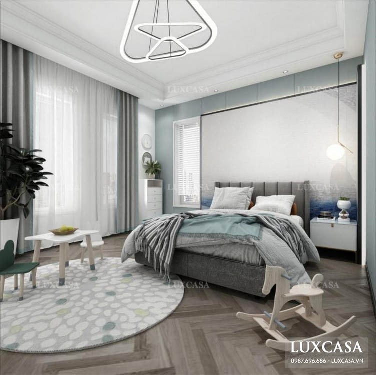 Tông màu chủ đạo pha giữa trắng và xanh nhạt xuyên suốt trong phong cách thiết kế giúp tạo không gian thư giãn và thoải mái cho phòng ngủ. Các thiết kế tối giản cùng chi tiết đèn trang trí đều được thống nhất mang lại sự thống nhất cho không gian. Đèn trần lạ mắt chính là điểm nhấn tạo nên sự tinh tế và thể hiện cá tính của gia chủ. Thêm vào đó, chiếc giường có gam màu xám đậm với chất liệu nhung cao cấp không chỉ mang đến những giấc ngủ trọn vẹn mà còn thể hiện đẳng cấp cho gia chủ.