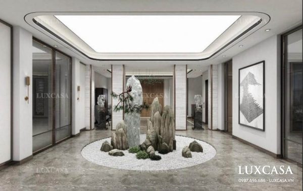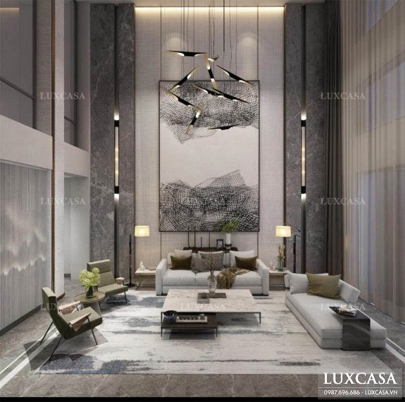Nhấn mạnh yếu tố độc đáo, cá tính, hiện nên trong thiết kế, các kiến trúc sư đã ưu ái với những gam màu trung tính tạo giác thanh thoát hơn cho không gian. Sự tương đồng giữa màu sắc của các chi tiết với điểm nhấn là 2 bên cột đá màu ghi đậm đem đến vẻ đẹp hài hòa, ấn tượng nhất định. Không quá nhiều chi tiết nhưng mỗi đường nét lại rất tinh xảo toát lên sự thật tinh tế và đẳng cấp của không gian cũng như gia chủ. Từ bộ sofa khệ nệ kết hợp cùng chiếc bàn đá mỏng duyên dáng, đến chiếc đèn trần thiết kế độc đáo hay bức tranh treo tường đậm chất nghệ thuật đều được kết hợp khéo léo và hài hòa với nhau.