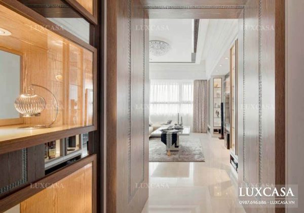 Cửa ra vào phòng khách được làm từ gỗ tự nhiên áp tường vô cùng sang trọng. Bên cạnh là chiếc tủ áp tường bằng gỗ và kính có đặt thêm lọ hoa và bộ ấm tách bằng ngọc sang trọng. Nhờ đó, các vị khách của gia chủ có thể tham quan và thưởng lãm trước khi bước chân vào khu vực tiếp khách của căn biệt thự