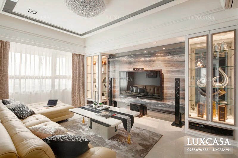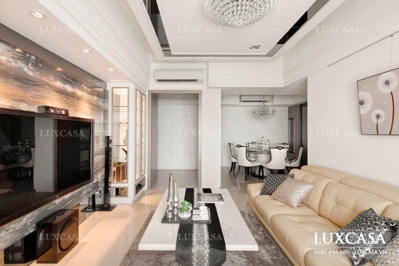 Các kiến trúc sư của Luxcasa sử dụng một bộ sofa dài màu kem sang trọng và một chiếc bàn trà màu trắng bằng đá tự nhiên cho khu vực tiếp khách. Đối diện ghế sofa sẽ là chiếc tivi màn hình phẳng hiện đại được gắn vào tường giúp tiết kiệm không gian hiệu quả.