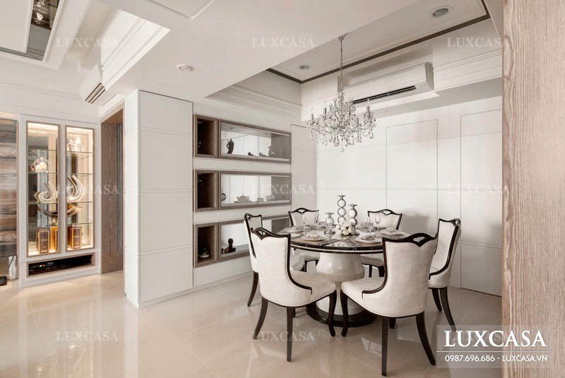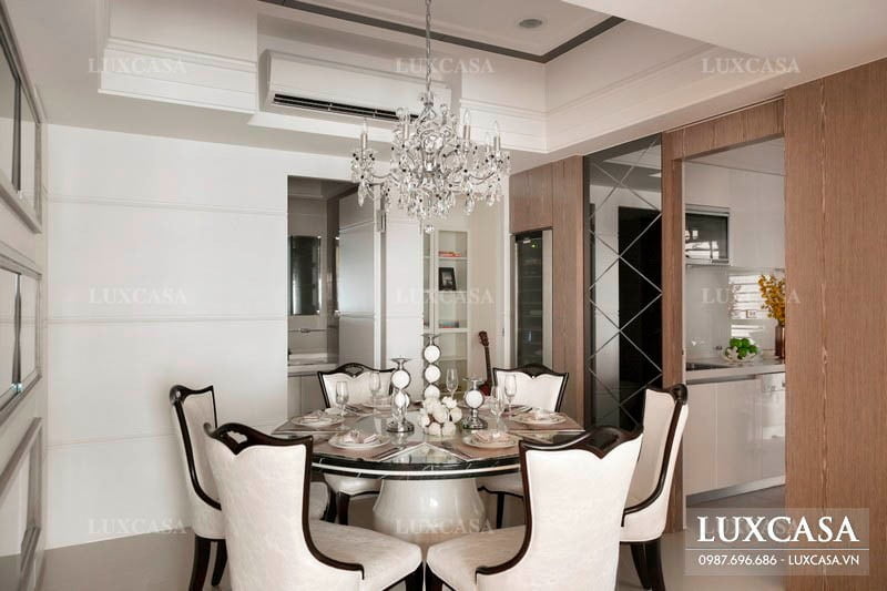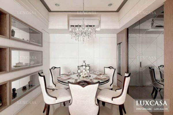 Bên trái phòng khách của căn biệt thự sẽ là sự chuyển tiếp đến phòng ăn của gia đình. Trong không gian này, các kiến trúc sư của Luxcasa tiết chế và đơn giản hóa các chi tiết một cách tối đa nhằm tạo sự ấm cúng và gần gũi cho không gian. Tường của phòng ăn sơn màu trắng tinh tế, kết hợp với một phần gỗ ốp tường mang lại sự sang trọng cho khu vực ăn uống của gia đình.