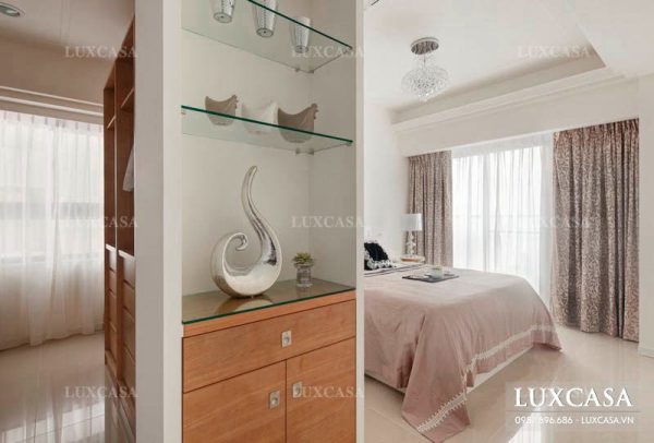 Ở phòng ngủ của căn biệt thự, các kiến trúc sư của Luxcasa chỉ sử dụng các sản phẩm nội thất cơ bản bao gồm giường, tủ và hệ thống đèn chùm, đèn ngủ để giảm bớt sự bí bách. Chiếc tủ gỗ với thiết kế đơn giản sẽ là nơi để đồ tiện dụng cho các thành viên. Một chiếc tủ nhỏ được đặt ngay cửa phòng để đặt thêm các lọ hoa trang trí giúp phòng ngủ trở nên lãng mạn hơn.