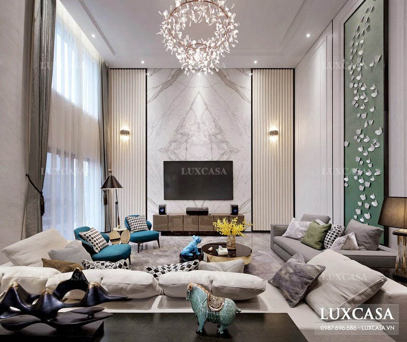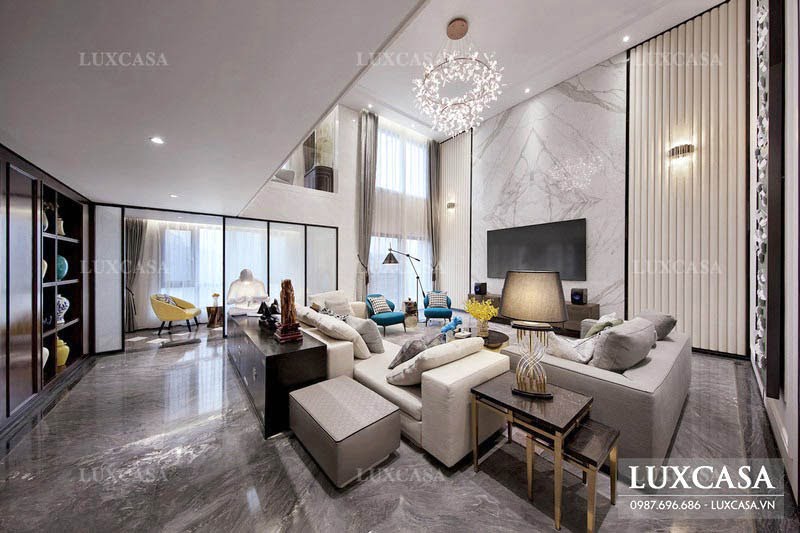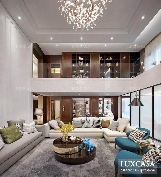 Về cơ bản, biệt thự thông tầng đã mang một nét độc đáo riêng với không gian phòng khách rộng rãi. Điều này không những góp phần làm đẹp cho các nội thất bên trong biệt thự mà còn kèm theo nhiều lợi ích khác như tạo góc quan sát rộng, tăng sự sang trọng cho toàn bộ không gian, tăng khả năng thông thoáng,… Trong căn biệt thự, khoảng thông tầng trở thành điểm nhấn quan trọng và là nơi giao tiếp giữa các không gian chính. Do đó, nó chiếm phần quan trọng trong thiết kế và thi công nội thất của toàn căn biệt thự.