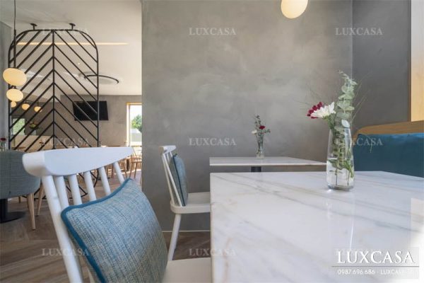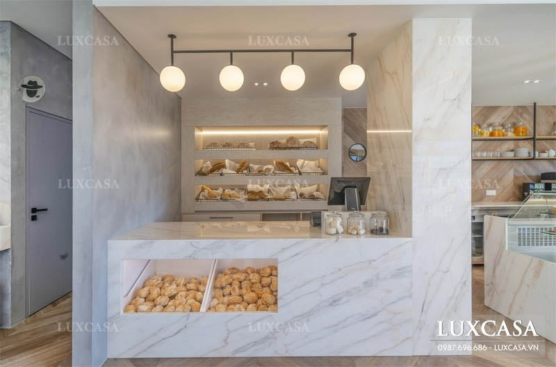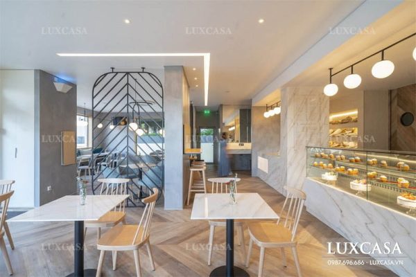 Kích thước quầy thu ngân hợp lý sẽ giúp bạn tiết kiệm được rất nhiều diện tích không gian. Quầy thu ngân tại tiệm bánh ngọt không đơn thuần là nơi giao dịch, thanh toán mà còn có công dụng rất lớn trong việc trang trí. Quầy thu ngân kết hợp cùng tủ đựng bánh sẽ là ý tưởng tuyệt vời dành cho bạn. Thiết kế nhà hàng hiện đại tối giản với gam màu trắng vân đá không chỉ mang đến sự sang trọng, trẻ trung mà còn giúp không gian của bạn sáng hơn rất nhiều.