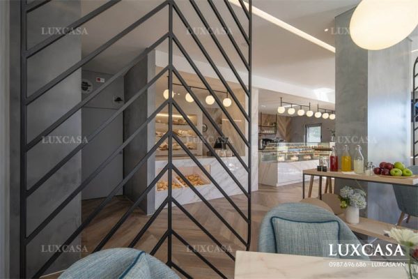 Nếu trước đây tiệm bánh của bạn chưa sử dụng vách ngăn thì bạn nên suy nghĩ đến việc thêm chi tiết này vào các đồ nội thất cần có trong quá trình cải tạo, sửa chữa. Vách ngăn không chỉ đem lại hiệu quả trang trí cho không gian, giúp cửa hàng của bạn có thêm điểm nhấn mà còn tạo không gian riêng tư cho khách hàng. Một chiếc vách ngăn nhỏ với thiết kế các thanh ngang chắn giữa không gian quầy thu ngân và nơi thưởng thức bánh ngọt của thực khách sẽ được đánh giá rất cao.