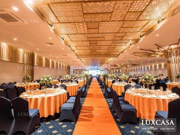 Tone màu chủ đạo là cam đất, xung quanh các bàn tròn là ghế tựa màu xanh đen giúp cân bằng màu sắc của không gian. Lối đi đến lễ đài được trải thảm cam đặt chính giữa phòng và kéo dài đến bục lễ với màn hình lớn. Khu vực khán đài được làm nổi bật nhờ bóng đèn rọi. Xung quanh là các trụ đỡ được lồng ghép trang trí với bóng đèn tạo thêm độ lung linh cho không gian