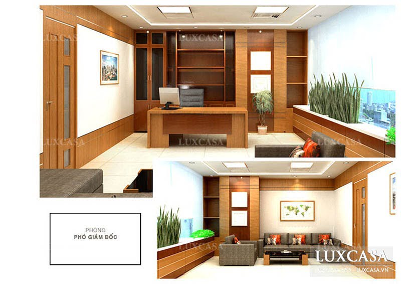Đây cũng là một phòng làm việc nhưng có diện tích nhỏ hơn phòng của giám đốc bởi vì nơi đây không thường xuyên tiếp đối tác. Chính vì điều này mà phòng phó giám đốc có một không gian hạn chế hơn phù hợp với việc giải quyết tình hình nội bộ của công ty cùng với nhân viên. Tại đây được kết hợp với một bàn làm việc, kệ sách, tranh treo tường và những đồ dùng nội thất khác tạo nên một văn phòng làm việc đầy hiện đại và sang trọng.