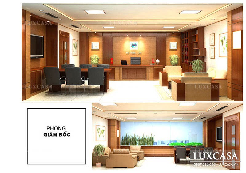 Phòng giám đốc là nơi họp bàn giao công việc, nơi để nghỉ ngơi, riêng tư của ban lãnh đạo. Nên không gian nơi đây phải được đảm bảo được sự rộng rãi phù hợp với chức danh, công việc của giám đốc.
