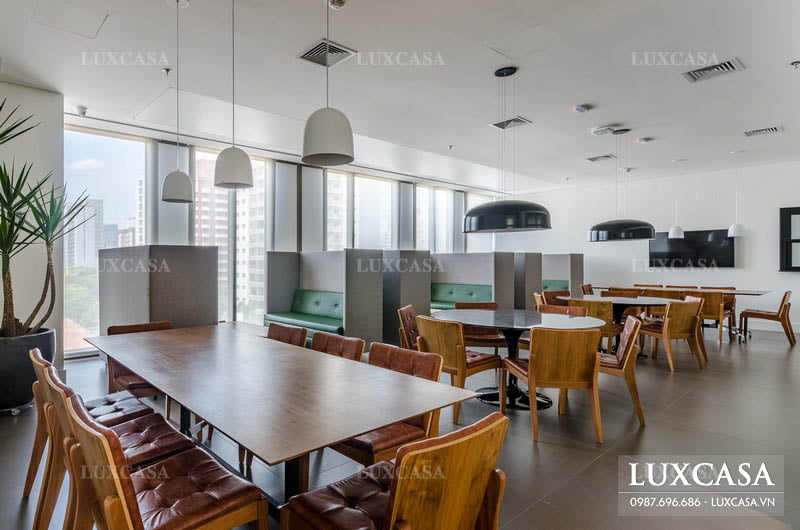 Khu vực phòng ăn của công ty được mở rộng ra, không gian thoáng đãng hơn với cách bày trí khoa học, đảm bảo phục vụ đầy đủ nhu cầu ăn trưa, nghỉ ngơi của các nhân viên.