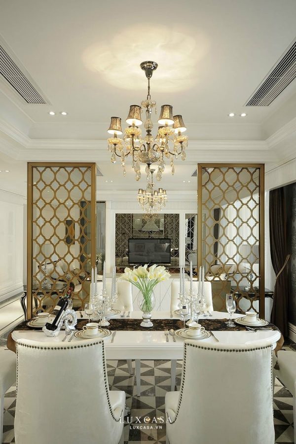 Nếu bạn muốn thi công nội thất biệt thự tân cổ điển thì đừng bỏ qua thiết kế vách ngăn ô quả trám này. Mẫu vách ngăn này được sản xuất từ chất liệu sắt cao cấp mạ sơn tĩnh điện với màu trắng sang trọng. Các ô kẻ chéo quả trám thiết kế đều đặn, tạo một sản phẩm vách ngăn vô cùng độc đáo mà không kém phần ấn tượng. Vách ngăn này sẽ giúp không gian được “mở rộng” nhờ sự “kết nối” với không gian liền kề.
