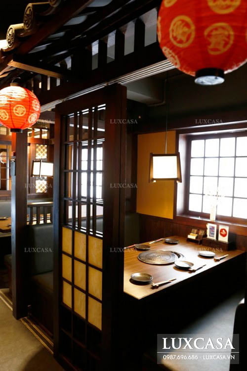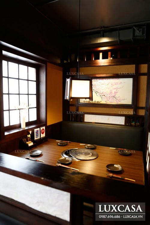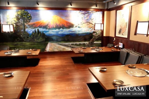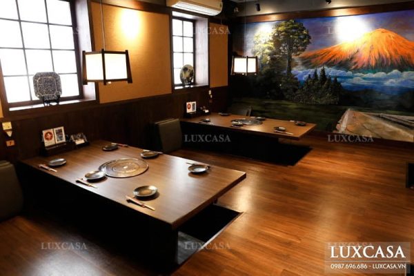Đặc trưng nội thất phong cách Nhật là sử dụng các đồ gỗ, giản lược đồ dùng, tính toán tỷ lệ chi tiết và sử dụng các tranh phong cảnh đặc trưng. Do đó, trong mẫu nhà hàng này, các KTS của Luxcasa đã vận dụng khéo léo để có không gian nhà hàng ấn tượng riêng. Các bàn ghế ngồi đều bằng gỗ được bố trí thành bàn riêng phục vụ từ 2-6 người/ bàn.