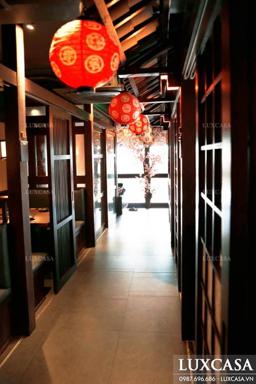 Các phòng riêng nhà hàng ngăn cách bởi cửa gỗ trượt giúp tiết kiệm diện tích, đồng thời nó cũng là một trong những nét riêng của văn hóa Nhật. Hành lang lối đi lại được treo các đèn lồng đỏ mang ý nghĩa tốt lành cùng mô hình cây hoa anh đào. Nơi đặt cây ở ban công được tận dụng làm nơi nghỉ/ khách chờ và thu hút tầm nhìn từ xa.