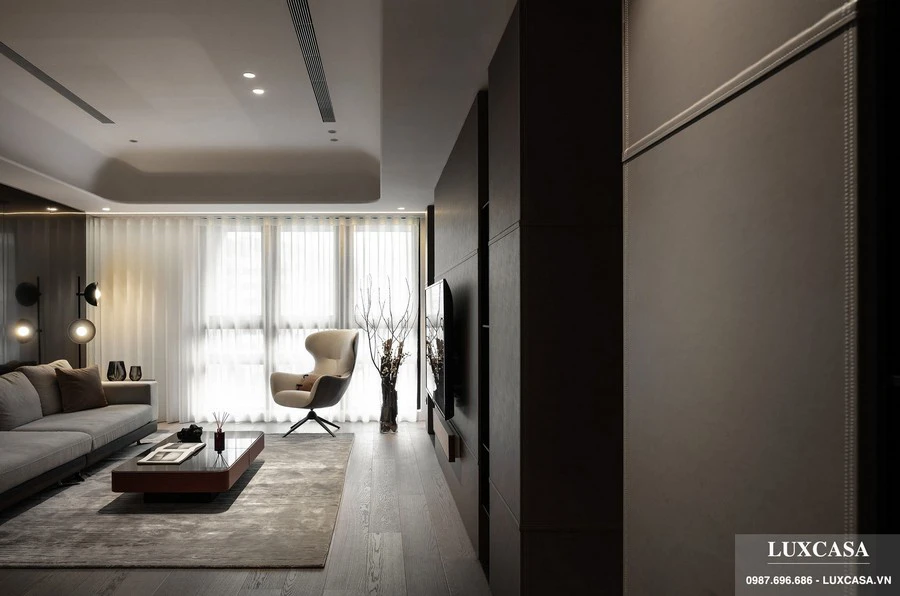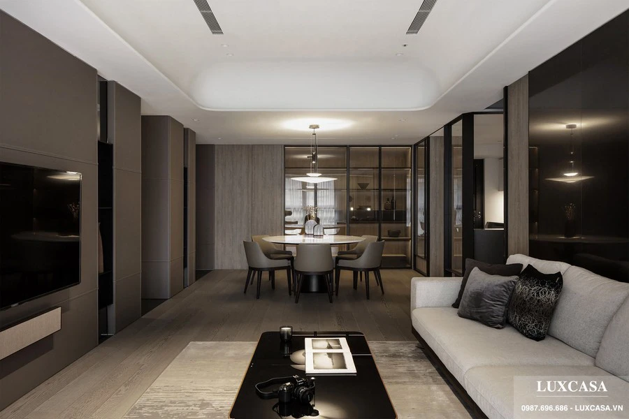 Thiết kế chung cư phong cách hiện đại mở nối liền không gian hướng đến sự thoải mái về công năng và thẩm mỹ. Phòng khách căn hộ sử dụng ghế sofa đi-văng, ghế tựa đơn xoay thoải mái. Đèn chiếu đứng ánh sáng vàng kết hợp cửa sổ kính cỡ lớn, tường gỗ sơn đen, bàn trà mặt kính bóng giúp tăng thêm sự sang trọng của không gian. KTS lựa chọn bố trí điều hòa âm trần trong mẫu thiết kế chung cư 3PN này để tối ưu không gian, mở rộng tầm nhìn.