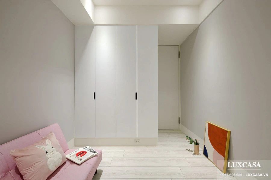 Một phòng phụ dùng làm nơi chứa đồ với tủ cao nhiều ngăn ô. Khi thiết kế, KTS đã lựa chọn dùng đèn led sát trần ánh sáng trắng để nhìn rõ và tạo cảm giác rộng cho khu vực này.