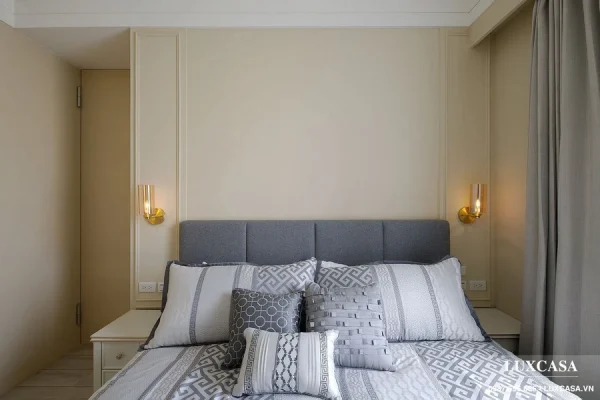 Đặc điểm phong cách nội thất tân cổ điển là đèn chùm, đèn gắn tường nên khi sắp xếp các phòng của chung cư cao cấp hầu hết đều được chọn các loại đèn kiểu cách. KTS đặt giường master ở gần giữa phòng tựa vào tường. 2 bên giường là tab gỗ và đèn tường.