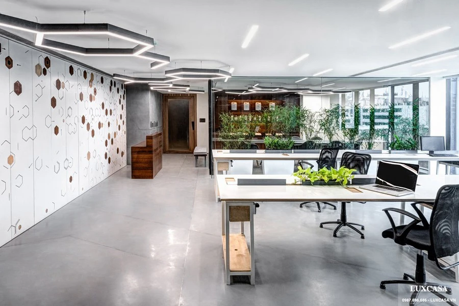 Trên mỗi bàn làm việc đều có những chậu cây xanh nhỏ, trên tường ngăn là những hoạt tiết lỗ đẹp mắt. Ánh sáng trong phòng làm việc là đèn bóng dài so le nhau, trần nhà ốp đá sáng màu giúp tạo cảm giác mở rộng thêm cho không gian. Bên cạnh khu làm việc chung là hành lang/ lối đi dẫn tới các phòng ban khác. Khu vực này sử dụng ánh sáng thiết kế cách điệu hình lỗ tổ ong rất đẹp mắt, tinh tế.