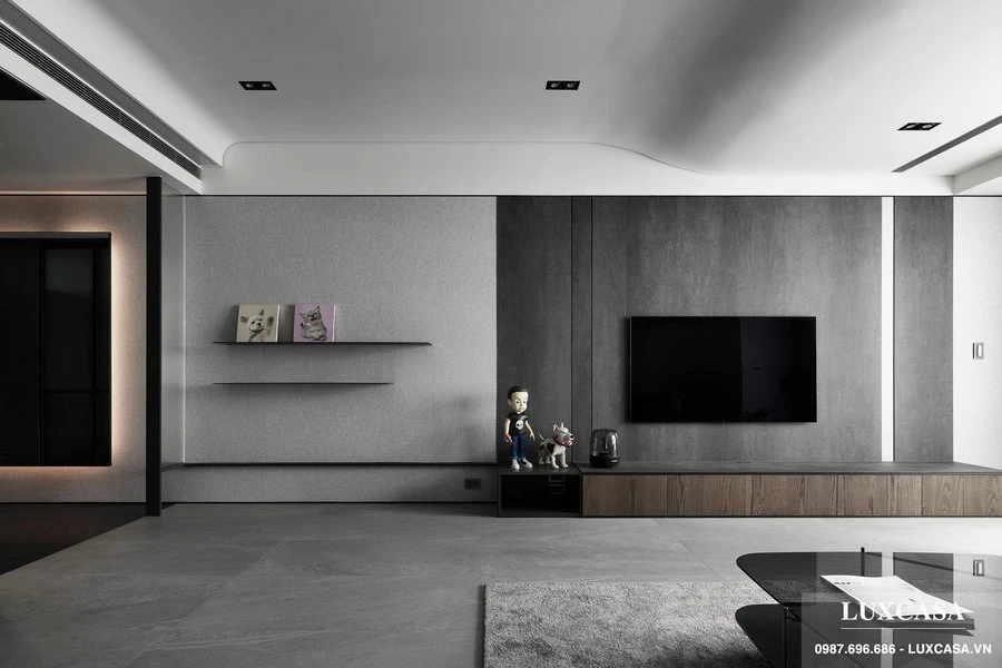 Phòng khách sử dụng điều hòa, đèn ẩn trong tường để bớt cản trở tầm nhìn.