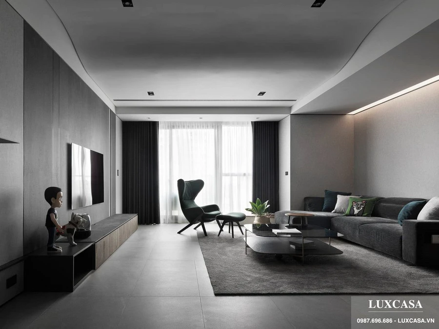 Khách hàng thuộc mệnh Mộc nên đa phần đồ nội thất chung cư theo màu đen và có xen kẽ 1 số cây xanh. Phòng khách chung cư phong cách hiện đại đơn giản. Sofa góc bọc vải nỉ ấm kèm ngăn đựng đồ bên hông tiện lợi. Đa số các chi tiết nằm trên thảm sàn màu ghi xám để phân tách khu vực. Kệ tivi bằng gỗ chữ I với mặt phẳng dài. Bức tường kê tivi có thêm lớp gỗ ốp tối màu và kệ decor trang trí.