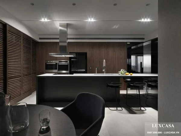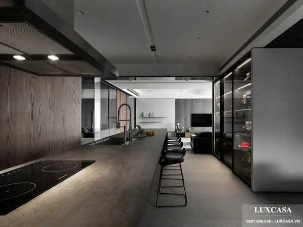Phòng bếp hợp phong thủy cần bố trí thuận tiện sử dụng, hướng kê đặt thuận tiện sử dụng. Gia chủ sử dụng bếp điện nên cần có thiết bị hút khói mùi và đèn chiếu sáng tập trung. Combo bàn sơ chế, khu rửa thực phẩm và bếp nấu cùng trên bàn giúp thu bớt khoảng cách đi lại, tránh tạo nhiều vết bẩn. Bàn sơ chế có thể thành bàn ngồi chơi thư giãn khi cần. Đằng sau là tủ gỗ sản xuất theo kích thước chung cư để đặt các vật dụng nhà bếp.