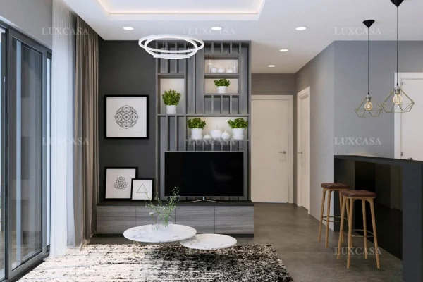 Khi trang trí căn hộ nhỏ này, các KTS Luxcasa đã khéo léo lồng ghép đèn led sát trần, các đèn chùm, đèn thả hiện đại với màu sắc, kiểu dáng khác nhau để tạo nên hiệu ứng thị giác ánh sáng và phân biệt các khu vực. Khu bếp nấu, bàn ăn và tiếp khách đều nối liền nhau trong cùng 1 không gian. Kích thước, số lượng các vật dụng được giản lược tối đa. Ngoài ra, các thảm lót sàn với màu sắc, kiểu dáng khác biệt giúp sàn sạch sẽ và để tách biệt thay vì cần tường/ vách ngăn.