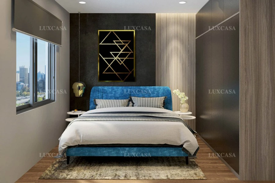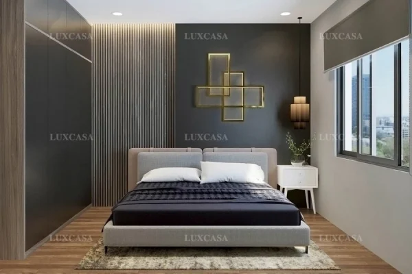 Thiết kế nội thất chung cư nhỏ 2 PN đẹp, tiết kiệm chi phí là tiêu chí chủ đạo của dự án này. Một phòng ngủ Master của bố mẹ và cho con trẻ. Mỗi phòng ngủ đều có cửa sổ ở phía lệch cuối giường để tăng độ sáng cho phòng. Các tủ đứng nhiều ngăn tầng vừa là vật phẩm trang trí vừa là đồ nội thất cần thiết cho phòng. Các đồ dùng từ gỗ hoặc giường da với vật liệu sản xuất được lựa chọn kỹ lưỡng đã qua xử lý để tăng độ bền, giữ màu và kiểu dáng ổn định lâu dài.