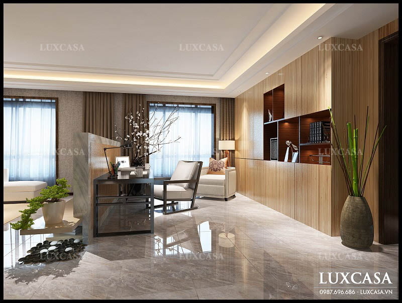 Dựa trên yêu cầu của gia chủ, công ty thiết kế Luxcasa đã bố trí thêm khu vực làm việc phía sau tivi. Một bức tường lửng dùng để ngăn cách phòng khách và không gian khu vực làm việc. Khu vực này có 2 ghế ngồi êm ái cùng ánh sáng tối ưu được điều chỉnh qua đèn điện và hệ thống rèm cửa riêng biệt. Phía sau là tủ gỗ đựng tài liệu kết hợp làm nơi trưng bày vật kỷ niệm, sưu tầm của gia chủ.